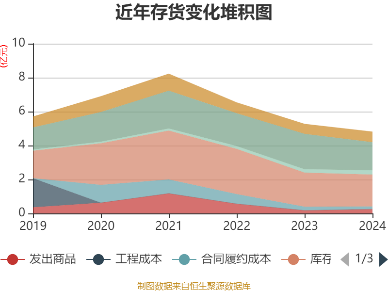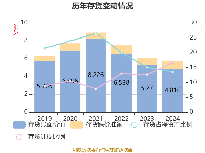 从存货变动来看,截至2024年末,公司存货账面价值为4.82亿元,占净资产的13.52%,较上年末减少4538.49万元。其中,存货跌价准备为9596.81万元,计提比例为16.62%。