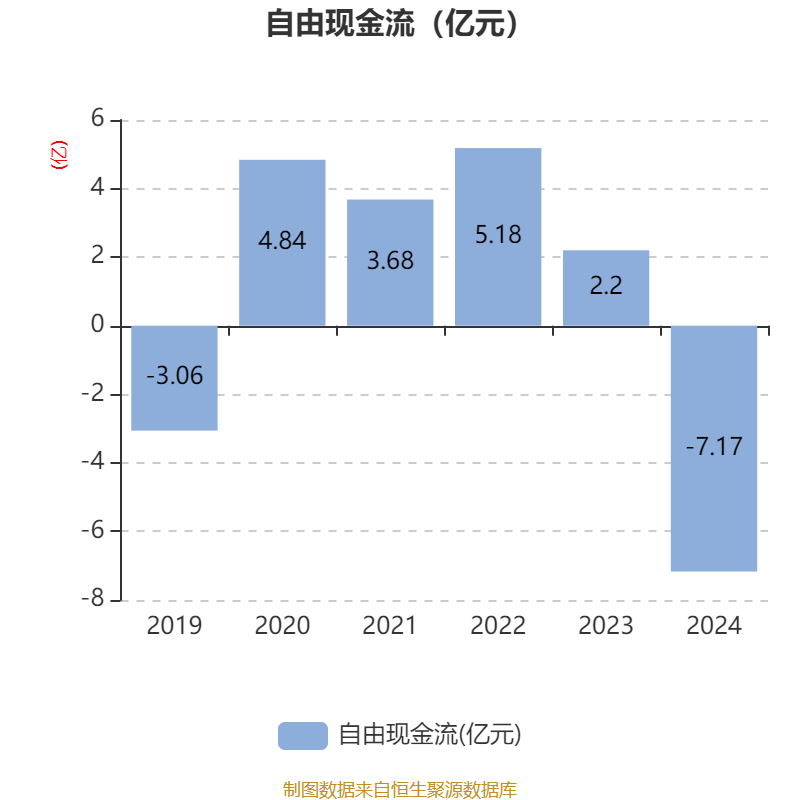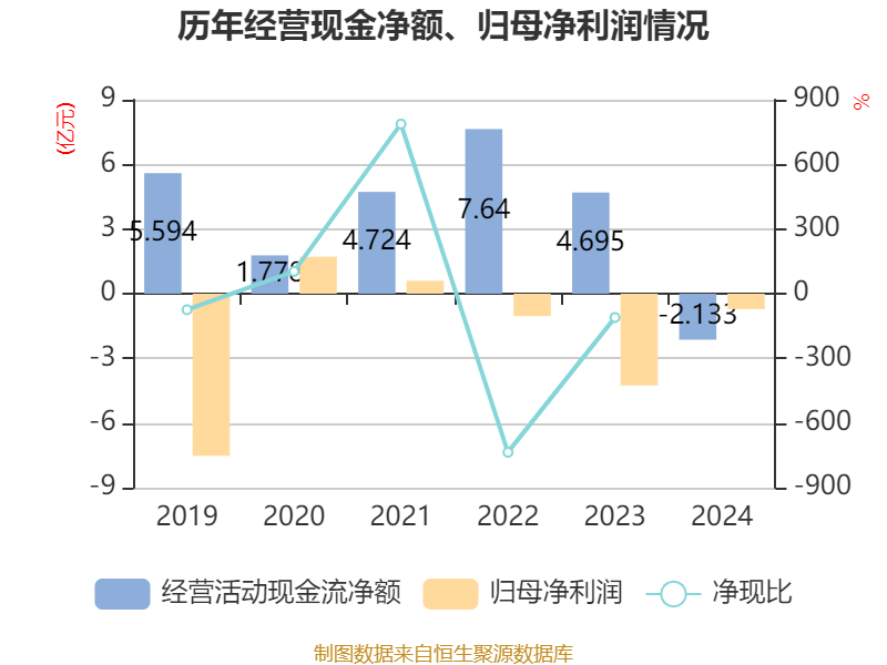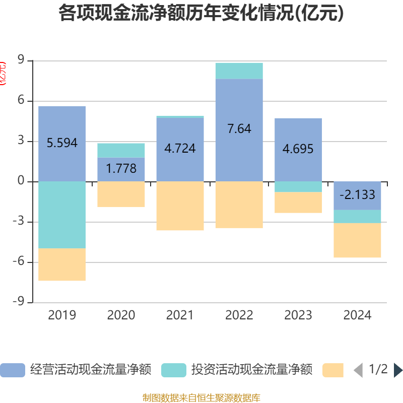 截至2024年,公司经营活动现金流净额为-2.13亿元,同比减少6.83亿元;筹资活动现金流净额-2.56亿元,同比减少1.01亿元;投资活动现金流净额-9771.41万元,上年同期为-8054.21万元。