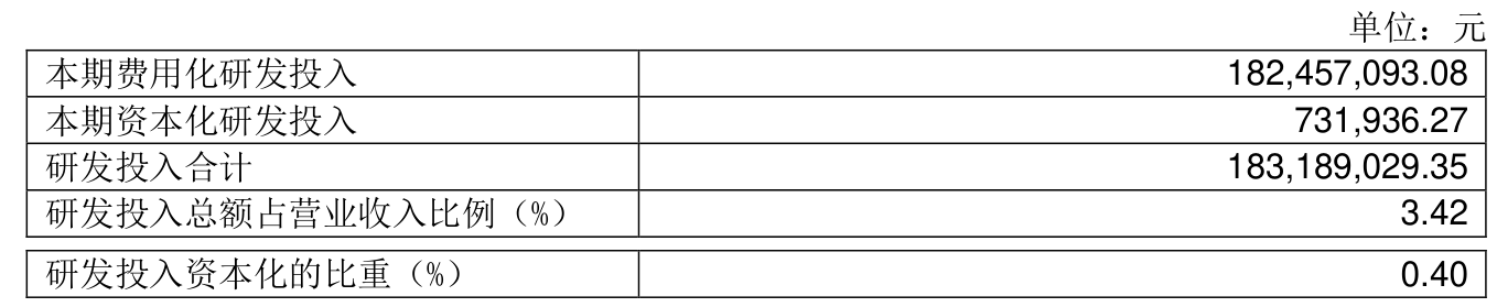 2024年全年,公司研发投入金额为1.83亿元,同比下降27.94%;研发投入占营业收入比例为3.42%,相比上年同期上升0.66个百分点。此外,公司全年研发投入资本化率为0.4%。