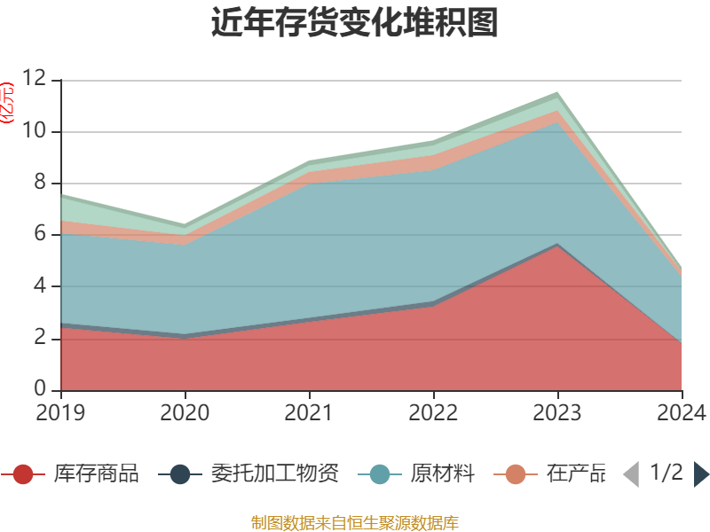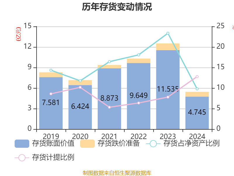 从存货变动来看,截至2024年末,公司存货账面价值为4.74亿元,占净资产的9.78%,较上年末减少6.79亿元。其中,存货跌价准备为6946.26万元,计提比例为12.77%。