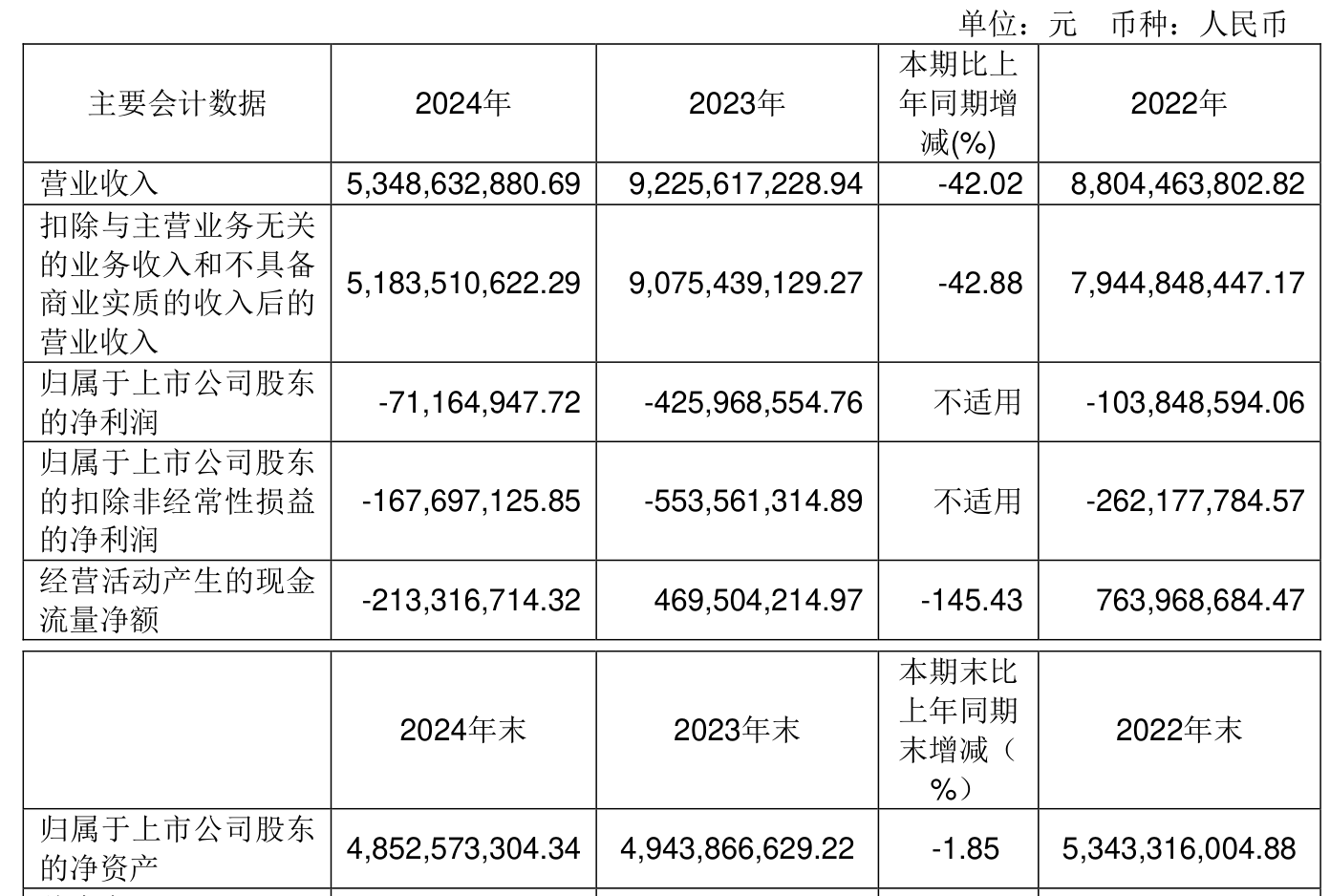 中证智能财讯航天机电(600151)3月8日披露2024年年度报告。2024年,公司实现营业总收入53.49亿元,同比下降42.02%;归母净利润亏损7116.49万元,上年同期亏损4.26亿元;扣非净利润亏损1.68亿元,上年同期亏损5.54亿元;经营活动产生的现金流量净额为-2.13亿元,上年同期为4.7亿元;报告期内,航天机电基本每股收益为-0.0496元,加权平均净资产收益率为-1.45%。