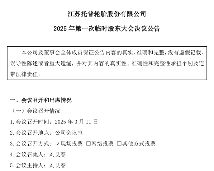 3月11日,江苏托普轮胎股份有限公司召开了 2025 年第一次临时股东大会。大会审议并通过了关于在柬埔寨设立两个全资子公司的两项议案。