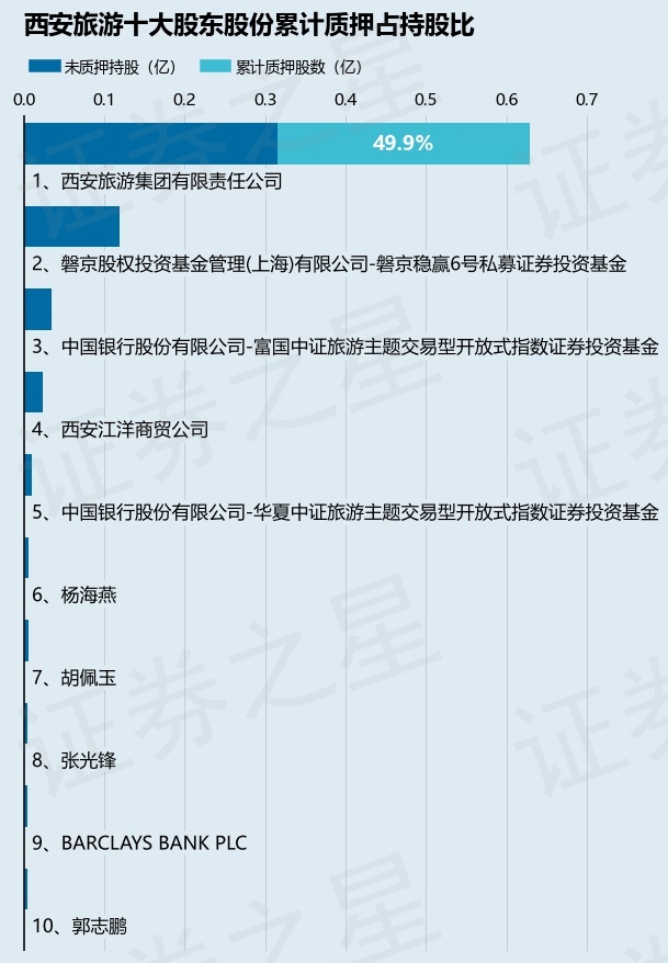 截止本公告日,股东西安旅游集团有限责任公司已累计质押股份3138.82万股,占其持股总数的49.9%。本次质押后西安旅游十大股东的累计质押股份占持股比例(占持股比例的计算以公司最新一期财务报表公布的十大股东的持股总数为基准)见下图: