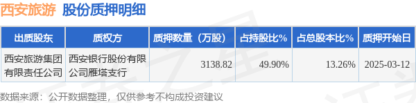 证券之星消息,西安旅游(000610)3月14日公开信息显示,股东西安旅游集团有限责任公司向西安银行股份有限公司雁塔支行合计质押3138.82万股,占总股本13.26%。质押详情见下表: