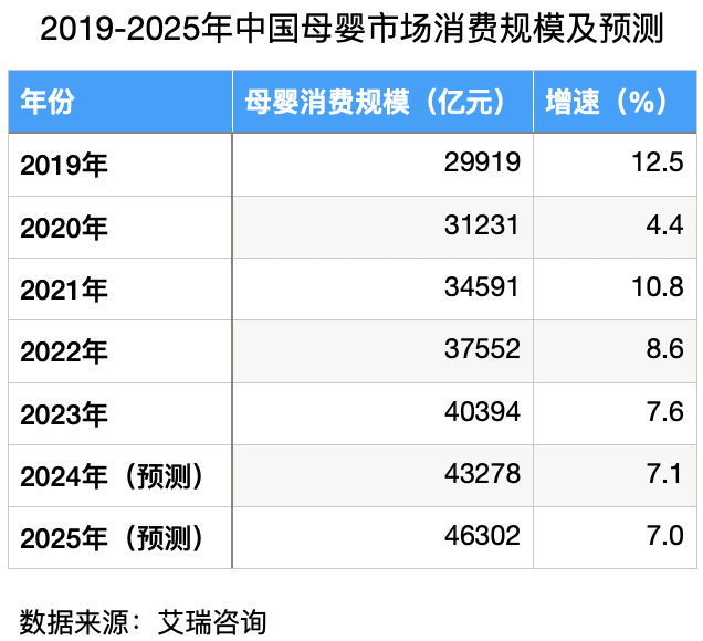 值得一提的是,近年来,国内母婴消费市场规模持续扩张。艾瑞咨询《2024年中国母婴亲子人群营销趋势洞察报告》显示,随着居民收入的稳步增长,中国家庭致力于追求高品质生育和精细化育儿,平均每个宝宝生育投入提升。在生育率逐步下降的趋势下,平均育儿投入的提升带动了母婴市场消费规模保持持续增长,2023年母婴市场消费规模达4万亿元,预计未来仍保持7%左右的增长态势。