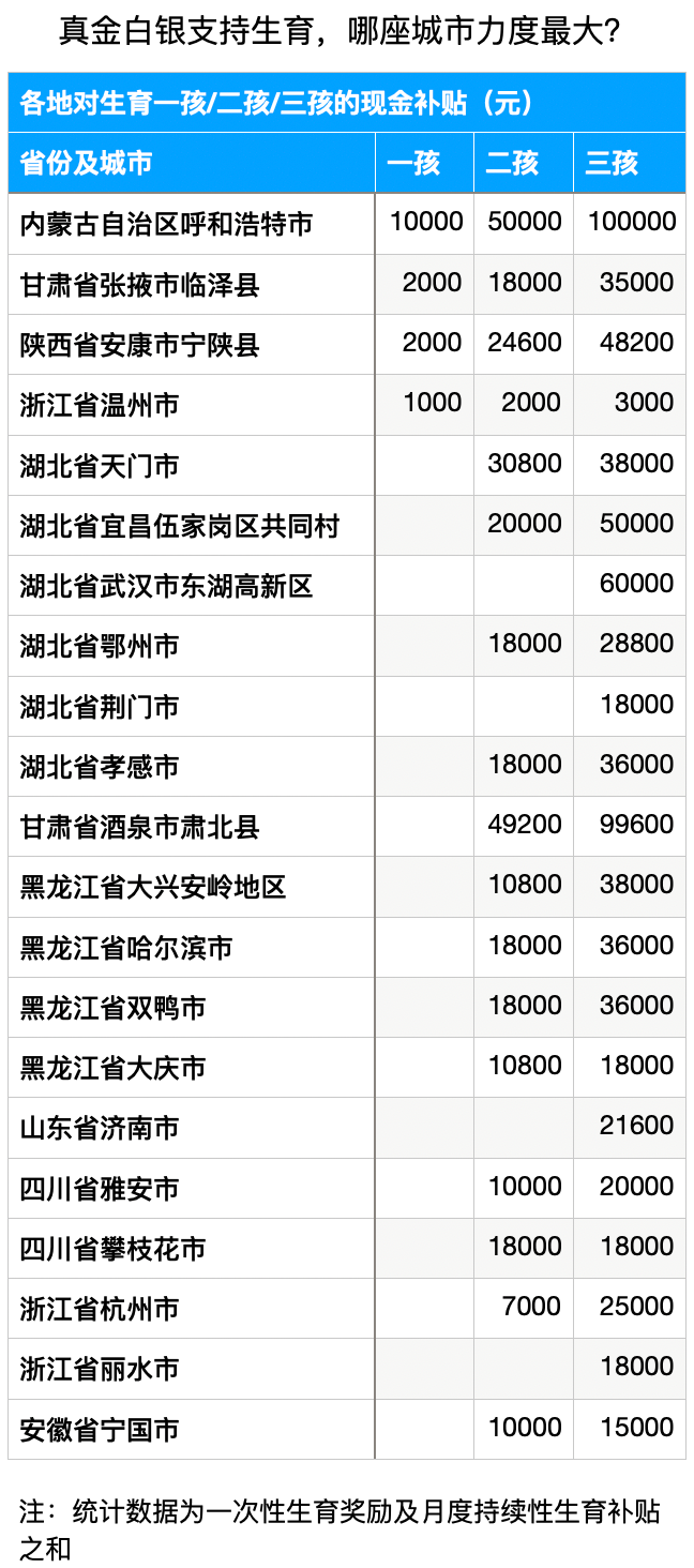 据南财快讯记者不完全统计,此前已有多地政府宣布发放生育现金补贴。整体来看,多数地区对生育二、三孩的现金补贴在1万元至2万元左右。