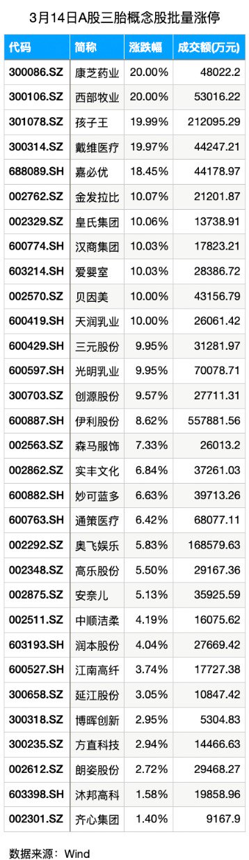 3月14日,A股全天震荡走高,创业板指领涨,沪指重回3400点创年内新高。截至收盘,沪指涨1.81%,深成指涨2.26%,创业板指涨2.8%。沪深两市全天成交额1.79万亿元,较上个交易日放量1851亿元。从板块来看,大消费股震荡走强,婴童概念方向爆发,万得三胎指数涨8.6%,孩子王等多股涨停。