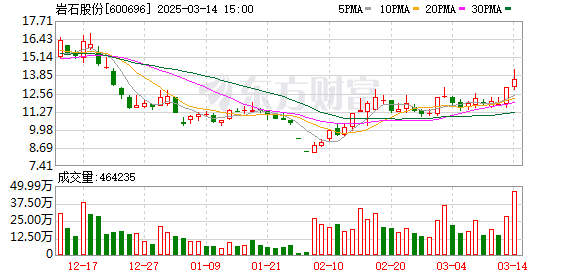 截至3月14日收盘,岩石股份报13.55元/股,总市值45.32亿元。
