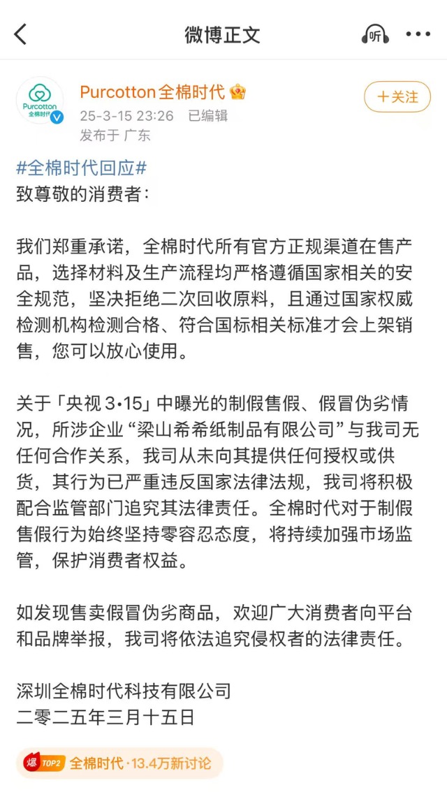 全棉时代方面表示:“关于央视‘3.15’中曝光的制假售假、假冒伪劣情况,所涉企业‘梁山希希纸制品有限公司’与我司无任何合作关系,我司从未向其提供任何授权或供货,其行为已严重违反国家法律法规,我司将积极配合监管部门追究其法律责任。全棉时代对于制假售假行为始终坚持零容忍态度,将持续加强市场监管,保护消费者权益。”