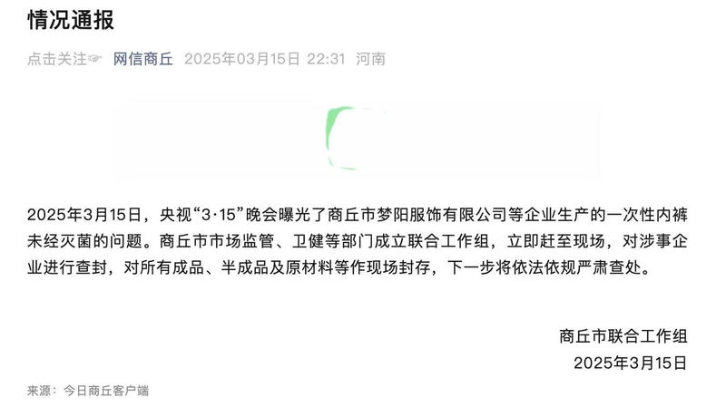 据网信商丘相关通报,2025年3月15日,央视“3·15”晚会曝光了河南省商丘市梦阳服饰有限公司等企业生产的一次性内裤未经灭菌的问题。商丘市市场监管、卫健等部门成立联合工作组,立即赶至现场,对涉事企业进行查封,对所有成品、半成品及原材料等作现场封存,下一步将依法依规严肃查处。