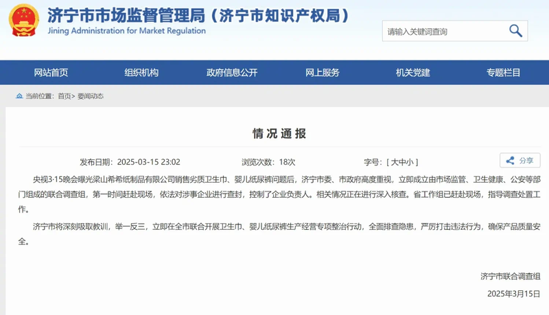 通报称,央视3·15晚会曝光梁山希希纸制品有限公司销售劣质卫生巾、婴儿纸尿裤问题后,济宁市委、市政府高度重视,立即成立由市场监管、卫生健康、公安等部门组成的联合调查组,第一时间赶赴现场,依法对涉事企业进行查封,控制了企业负责人。相关情况正在进行深入核查。省工作组已赶赴现场,指导调查处置工作。