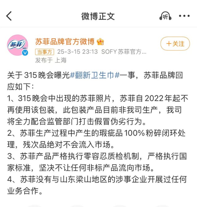 苏菲品牌回应称:“315晚会中出现的苏菲照片,苏菲自2022年起不再使用该包装,此包装产品目前非我司生产,我司将全力配合监管部门打击假冒伪劣行为。苏菲生产过程中产生的瑕疵品100%粉碎闭环处理,残次品绝对不会流入市场。苏菲没有与山东梁山地区的涉事企业开展过任何业务合作。”