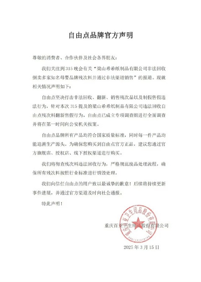 百亚股份以自由点品牌身份发布声明。其在声明中称,“自由点坚决打击非法回收、翻新、销售残次品以及制假售假违法行为,针对本次”3.15“提及的梁山希希纸制品有限公司违法回收自由点残次料翻新售假行为,自由点已成立专项调查组进行全面调查并将在第一时间向公安机关报案。”