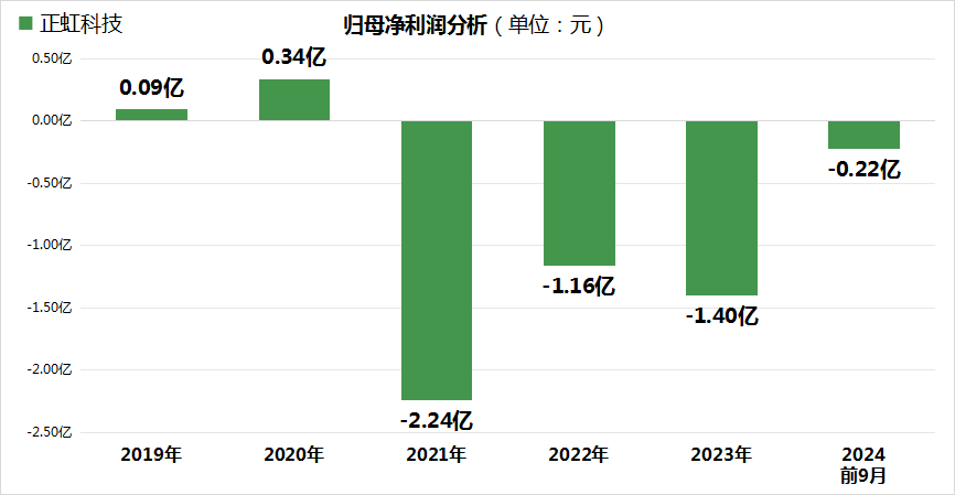 2024年前三季,正弘科技依旧亏损,金额为-0.22亿元。