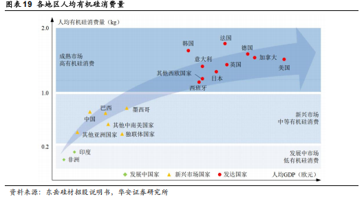 发展中国家有机硅消费升级,人均有机硅消费量仍有提升空间。新兴市场国家人均 GDP 较低,人均有机硅消费量与发达国家相比还有很大差距,目前,中国等新兴市场国家人均有机硅消费量不到 1kg,而西欧、北美、日、韩等发达国家和地区已接近 2kg。随着经济的不断发展,新兴市场国家的有机硅消费需求仍有巨大增长潜力,我国凭借人口基数大、人均消费量低的特点,未来将成为全球主要的有机硅需求增长区域。