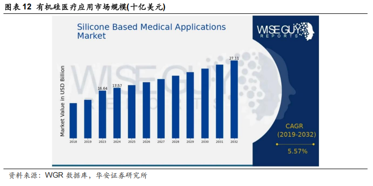 医疗领域:慢性病的日益流行以及对微创手术的需求不断增加正在推动对先进医疗设备和植入物的需求。而有机硅材料具有生物相容性、灵活性和耐用性等特点,是各种医疗应用的理想选择,现已广泛应用于外科手术,包括假肢和整形外科应用以及医疗导管以及医用辅材中,并将以其独特优势逐步替代传统材料。同时,新兴市场的快速经济增长和医疗保健意识的提高正推动医疗保健基础设施的扩张。建设新诊所、医院引致的对各类医疗设备和用品的需求,将进一步推动全球有机硅医疗应用市场规模增长。根据 WGR 数据库预测,2032 年有机硅医疗应用市场规模将达到 271.1 亿美元,2019-2032 年 CAGR 预计约为 5.57%。