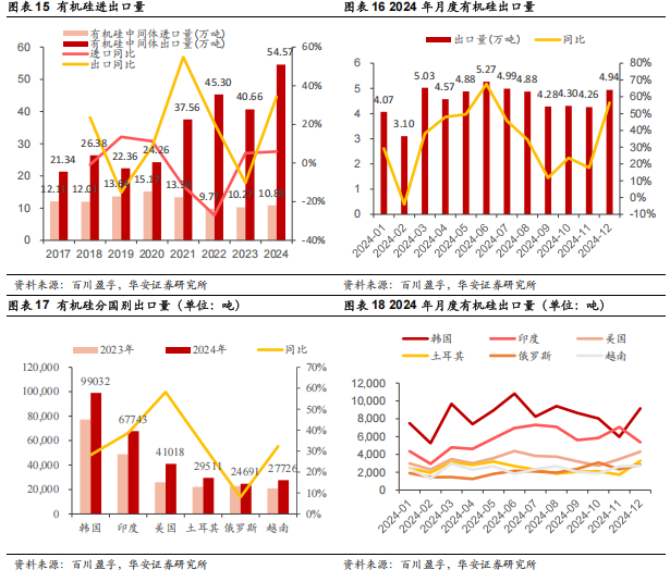 出口方面:2024 年我国有机硅中间体出口同比大幅增长,总出口量达到 54.57 万吨,近 5 年 CAGR 达到 22.46%。从出口结构来看,韩国是最大的出口国,印度、美国、土耳其、越南等市场贡献也较为明显。随着新兴经济体国家经济水平提升,人均有机硅消费量将快速提升,促进有机硅出口量持续提升。