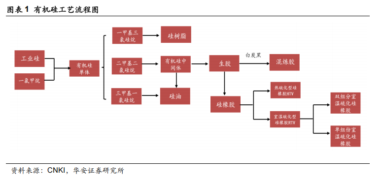 有机硅是指含有Si-C键、且至少有一个有机基团是直接与硅原子相连的化合物。其中,以硅氧烷(-Si-O-Si-)为骨架、侧链通过硅原子与其他有机基团相连的聚硅氧烷,是有机硅化合物中为数最多,应用最广的一类,约占总用量的 90%以上。从工艺流程看,工业硅和一氯甲烷是有机硅的原料,两者先合成有机硅单体,二甲基二氯硅烷是最主要的有机硅单体,通过二甲基二氯硅烷水解得到有机硅中间体 DMC 等,进而得到有机硅生胶以及硅橡胶。