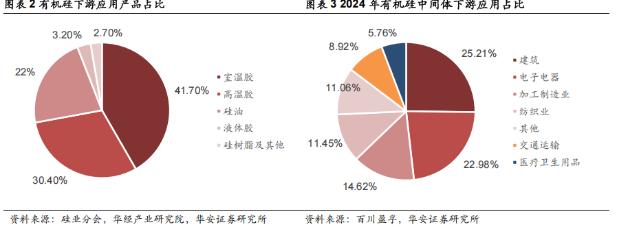 有机硅下游应用领域涉及建筑、电子、新能源、纺织、医疗等众多行业,其中建筑领域占比最大,达到 25.21%。有机硅是国民经济发展不可或缺的新型材料。下游应用占比最大的为硅橡胶,占比达到 72.1%,其中室温胶占比 41.7%,高温胶占比30.4%,产品主要为密封胶以及结构胶等。第二大下游产品为硅油,占比达到 22%,剩下为硅树脂等。终端应用领域方面,建筑领域是有机硅下游第一大应用领域,占比为 25.21%,主要产品为室温硅橡胶类的有机硅密封胶,第二大应用领域为电子领域,占比达到 22.98%,主要产品为高温硅橡胶类的电子密封胶以及结构胶。加工制造业领域占比为 14.62%,纺织领域占比为 11.45%,主要应用产品为硅油等功能性产品。