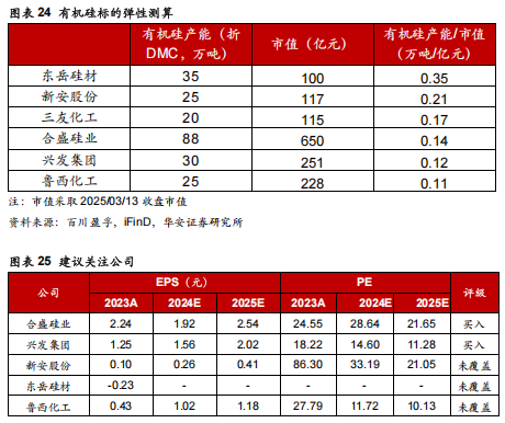 有机硅行业作为典型的周期成长行业,经过过去 3 年的密集产能扩张,2025 年新增产能显著减少,本轮产能周期接近尾声,有机硅行业的景气度有望触底回升,迎来行业拐点。建议关注有机硅行业企业合盛硅业、兴集团、新安股份、东岳硅材、鲁西化工、三友化工。同时建议关注有机硅产业链下游企业江瀚新材、晨光新材、宏柏新材。