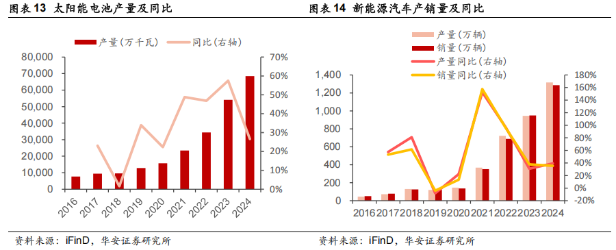 汽车领域:新能源汽车对硅胶使用量约为 20 千克/辆,传统汽车硅胶使用量约为 2.5 千克/辆。根据国家统计局数据显示,2024 年我国新能源车产量为 1316.8 万辆,汽车总产量为 3155.93 万辆,可估算汽车领域对硅胶的消费量达到 30.93 万吨,同比增长 28.6%。同时,新能源汽车销售市场渗透率快速上升,2015 年 11 月首次突破 1%,2023 年达到 31.6%,2024 年已达到 49.4%。新能源车渗透率提升将明显拉动有机硅中间体行业需求。