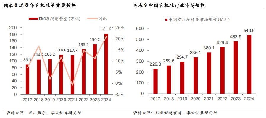 受益于国内电子等下游领域的高速发展,有机硅应用领域以及消费量逐年提升。2017 国内 DMC 消费量为 89.32 万吨,2024 年 DMC 消费量达到 181.64 万吨,CAGR 达到 10.67%。