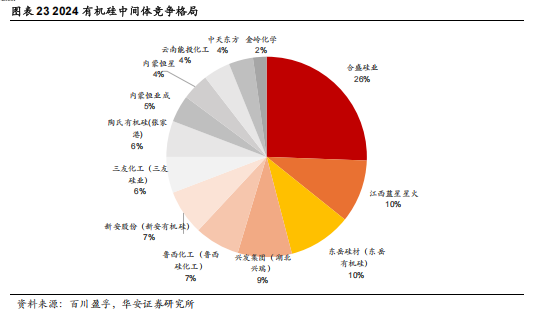 近年来,中国有机硅行业的集中度较高。截至 2024 年底,国内 DMCCR5 产能占比达到 62%。其中,合盛硅业产能占比达到 26%,形成了一超多强的格局。上市公司东岳硅材、兴发集团、鲁西化工、新安股份、三友化工产能规模也靠前。