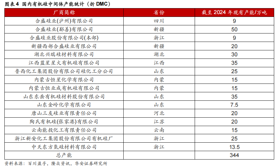 全球有机硅产能集中于中国,中国有机硅行业产能扩张基本结束。有机硅是工业硅下游的重要应用领域,而中国作为工业硅产能及有机硅需求最大国家,有机硅产能也因此成为全球最大。以有机硅中间体计算,截至 2024 年,海外企业有机硅中间体(硅氧烷)总产能共计 171.7 万吨,集中在陶氏、埃肯、瓦克、迈图和信越等企业中,其中陶氏总产能 54.5 万吨,是海外有机硅最大企业。而中国有机硅中间体总产能达到 344 万吨,产能主要集中在合盛硅业、东岳有机硅、兴发集团、蓝星星火等企业中,其中合盛硅业拥有 88 万吨(折 DMC),是全球有机硅产能最大公司。