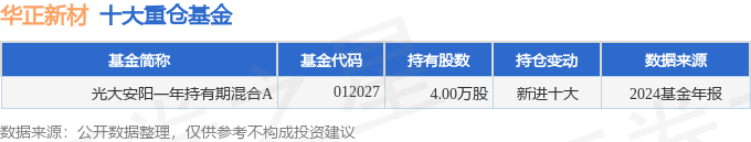 持有华正新材最多的基金为光大安阳一年持有期混合A,目前规模为0.77亿元,最新净值1.0774(3月18日),较上一交易日上涨0.0%,近一年上涨6.54%。该基金现任基金经理为黄波华叶舒。