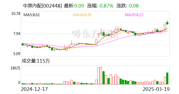 中原内配(002448.SZ)3月19日在投资者互动平台表示,公司下属子公司中原内配集团智能装备有限公司目前从事数控机床、非标专用机床等的研发和生产,目前没有工业机器人相关业务。公司下属子公司河南中原智信科技股份有限公司的室外重载AGV车(无人叉车)和码垛机器人已实现对外销售,中原智信将继续聚焦汽车整机及零部件制造的智能化升级,通过技术迭代升级,不断提高核心能力。