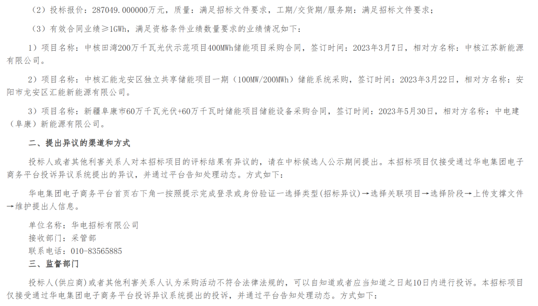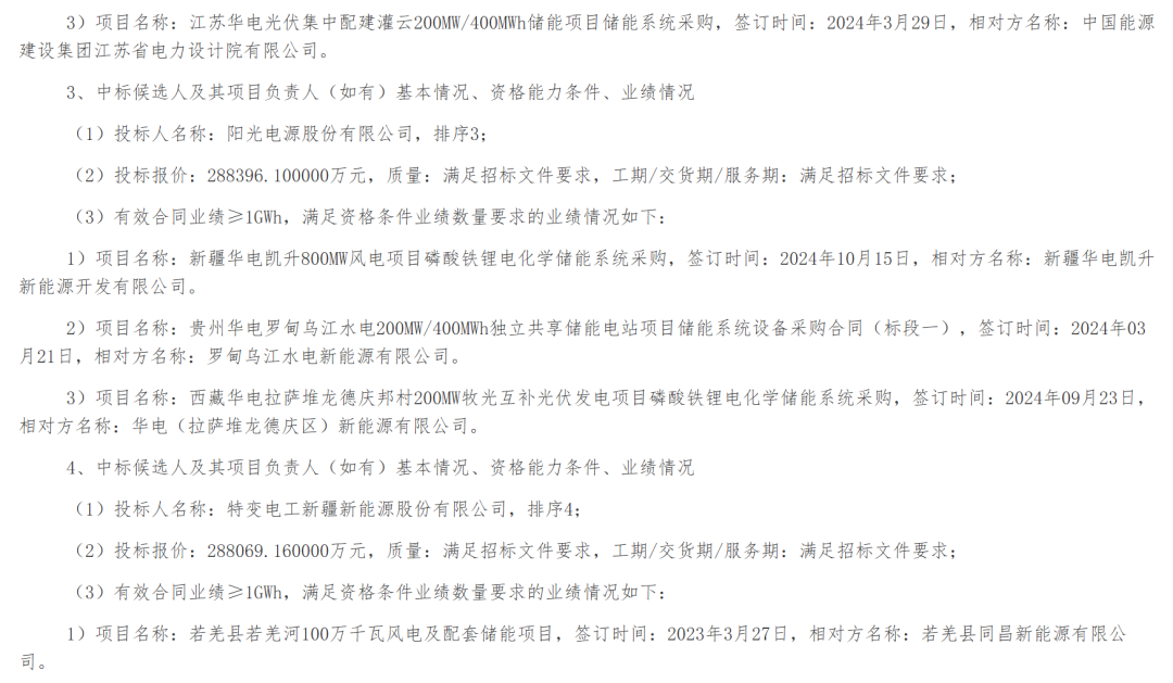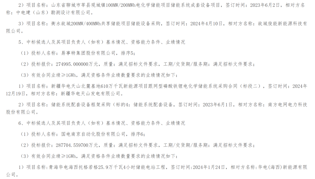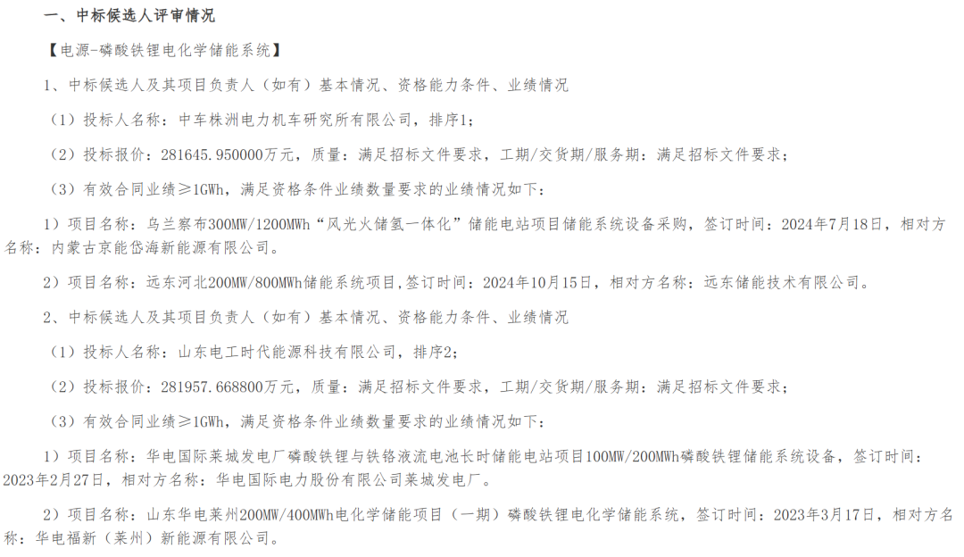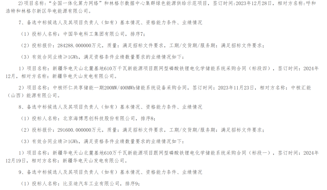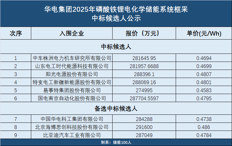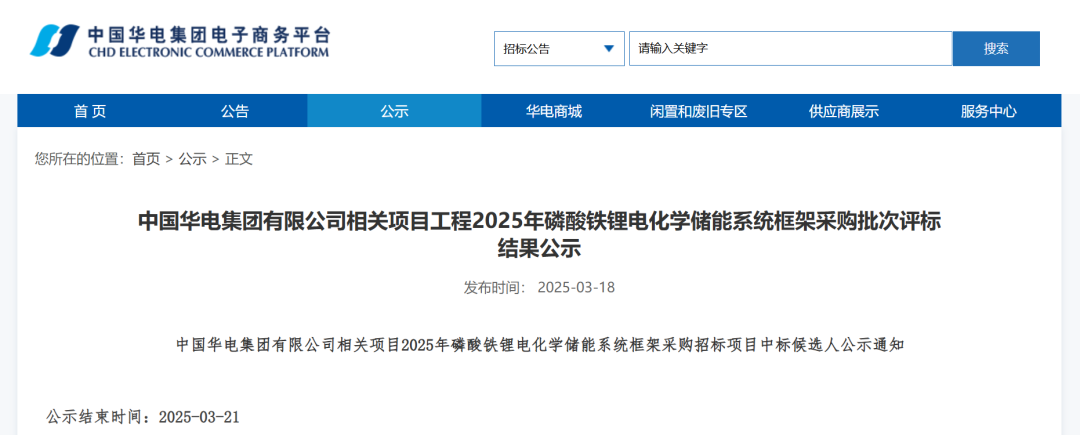 「储能100人」获悉,3月10日,华电集团2025年磷酸铁锂电化学储能系统框架采购公布中标候选人。