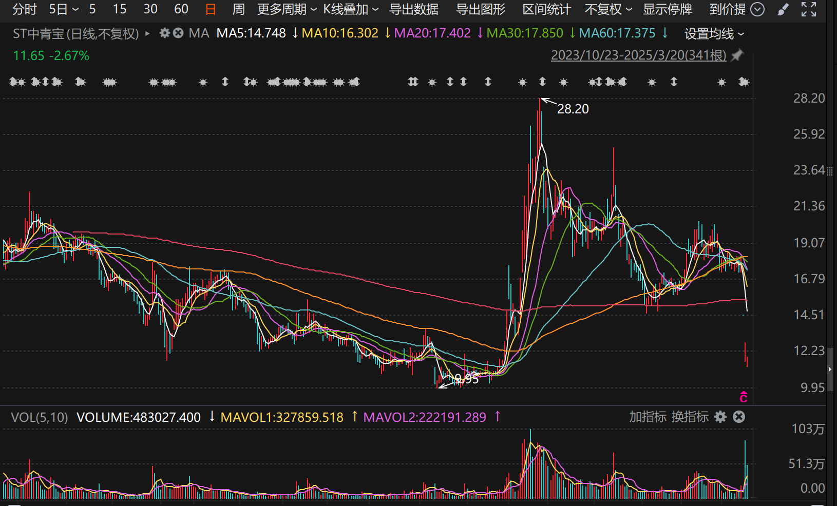 2025年3月20日,ST中青宝股价继续下跌2.67%,收于11.65元。