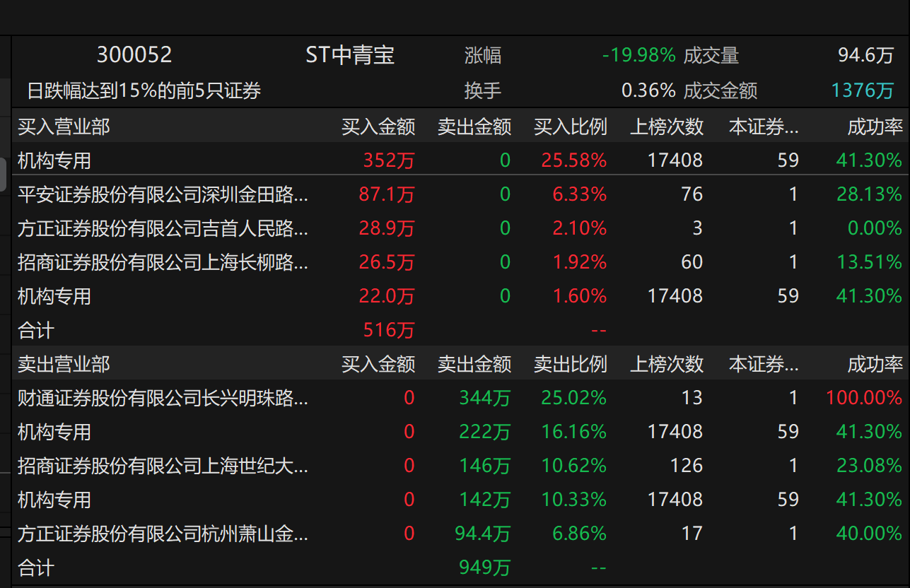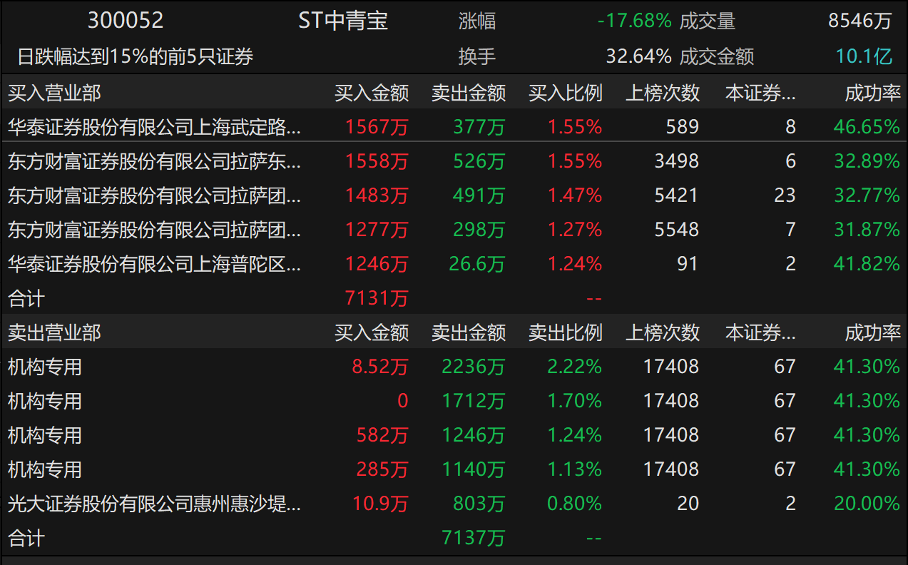 ST中青宝3月18日复牌首日跌停,19日再跌17.68%,20日继续再跌2.67%,三天累计跌幅超35%。盘后数据显示,3月18日2家机构、19日4家机构集中抛售。