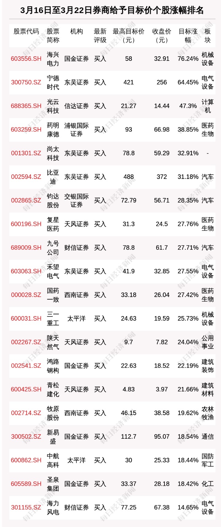 每经AI快讯,3月16日至3月22日,券商给予评级的个股数共有163只,获得买入评级的个股数共有95只。在公布了目标价格的22只个股中,按照最新收盘价计算,预期涨幅排名居前的个股是海兴电力(603556.SH)、宁德时代(300750.SZ)、光云科技(688365.SH),预期涨幅分别是76.24%、64.45%、47.3%。