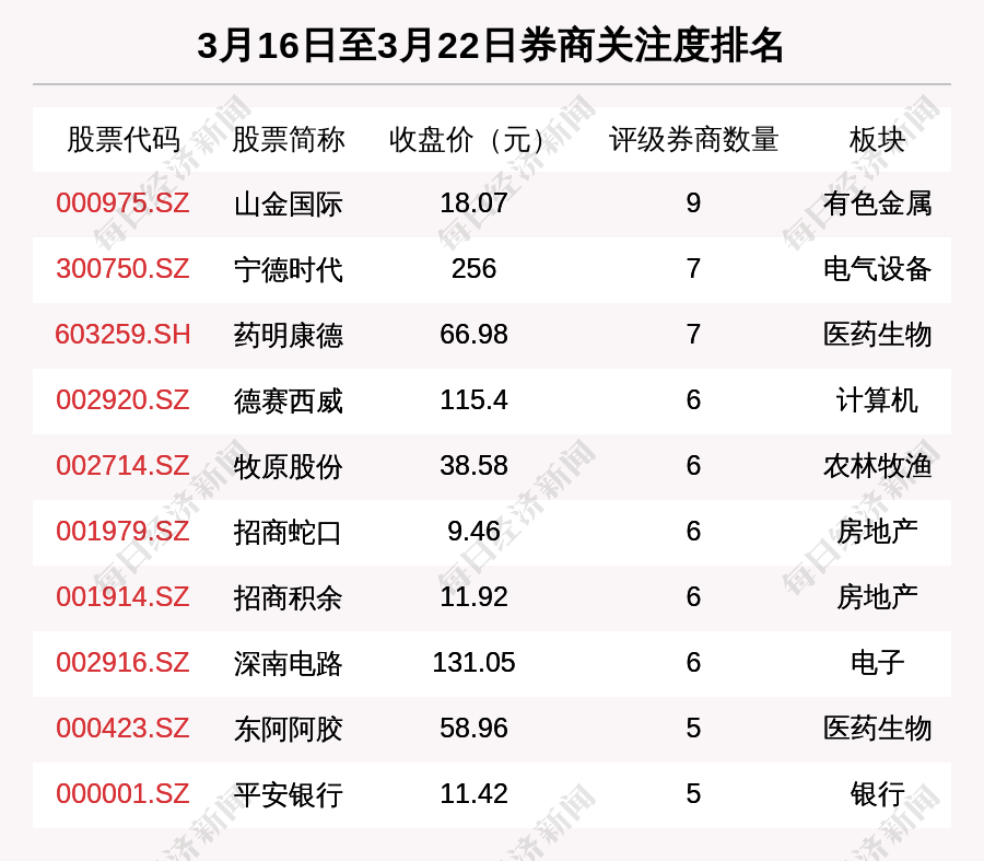 从券商对个股的关注程度来看,有50只个股获得多家券商关注,券商关注数量排名居前的个股是山金国际(000975.SZ)、宁德时代(300750.SZ)、药明康德(603259.SH)。
