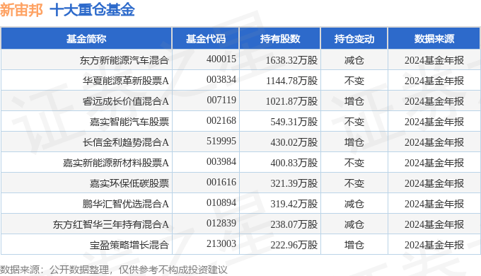 持有新宙邦最多的基金为东方新能源汽车混合,目前规模为87.36亿元,最新净值2.0965(3月25日),较上一交易日下跌0.2%,近一年上涨13.5%。该基金现任基金经理为李瑞。