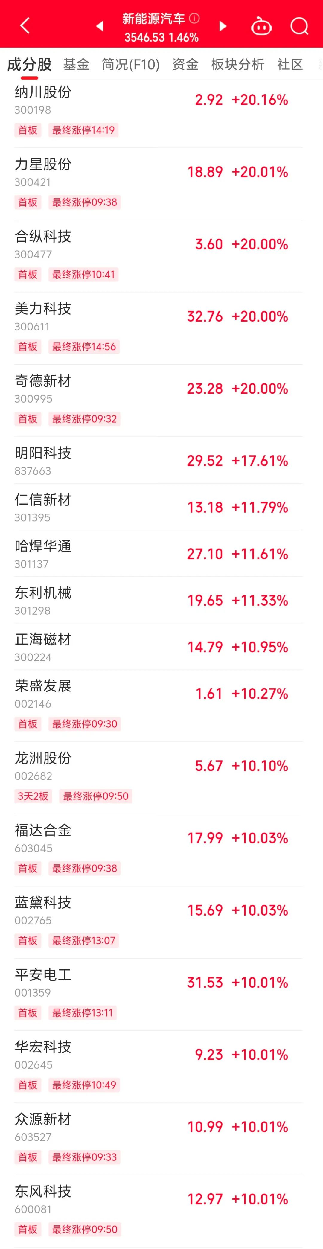 分板块来看,新能源汽车板块26只个股涨停,包括纳川股份(维权)(300198)、力星股份(300421)、合纵科技(维权)(300477)、奇德新材(300995)、荣盛发展(002146)、龙洲股份(002682)、福达合金(603045)等。同时该板块今日获主力资金净流入居首,达35.24亿元。
