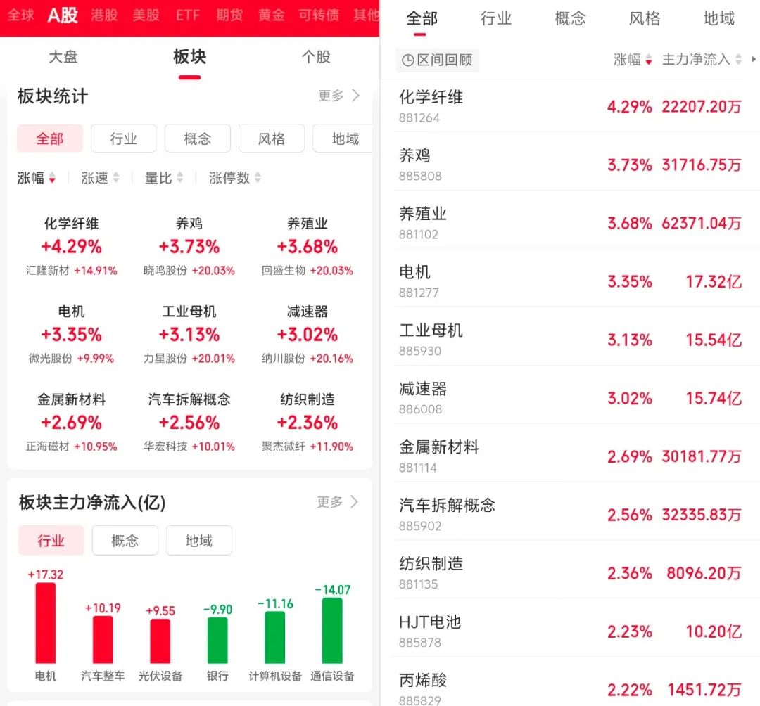化学纤维板块领涨,涨4.29%。三房巷(600370)、海利得(002206)、尤夫股份(002427)等3只个股涨停。3月26日,中复神鹰、华峰化学、神马股份公布2024年年报。