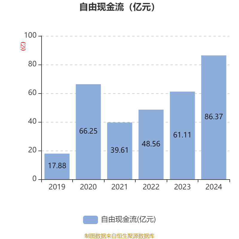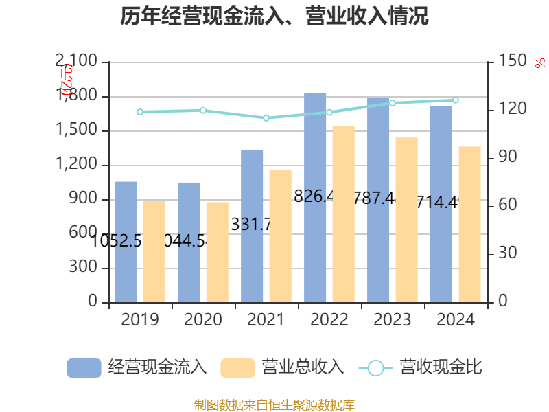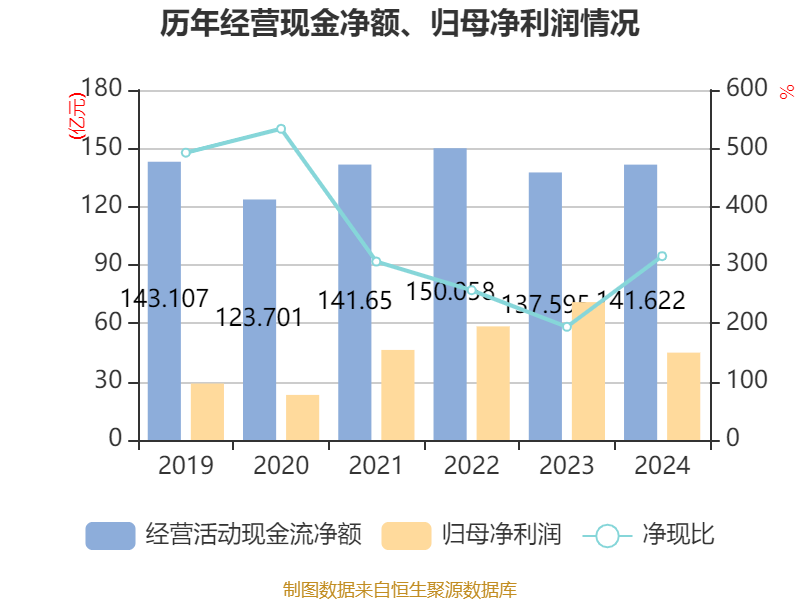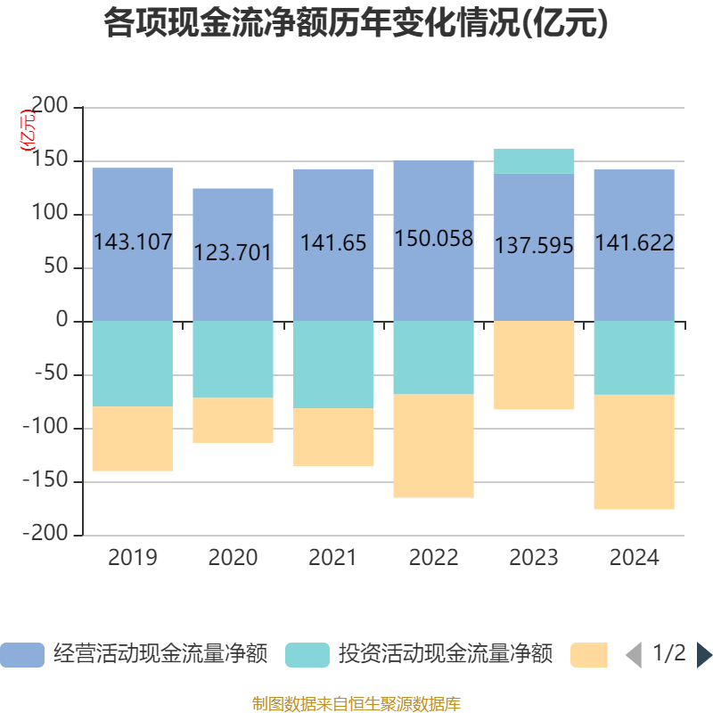 截至2024年,公司经营活动现金流净额为141.62亿元,同比增长2.93%;筹资活动现金流净额-107.2亿元,同比减少24.42亿元;投资活动现金流净额-69.06亿元,上年同期为23.31亿元。