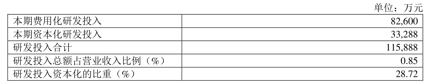 2024年全年,公司研发投入金额为11.59亿元,同比下降14.39%;研发投入占营业收入比例为0.85%,相比上年同期下降0.09个百分点。此外,公司全年研发投入资本化率为28.72%。