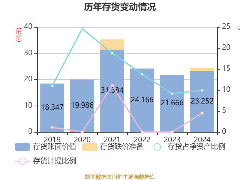 从存货变动来看,截至2024年末,公司存货账面价值为23.25亿元,占净资产的9.91%,较上年末增加1.59亿元。其中,存货跌价准备为1.1亿元,计提比例为4.51%。