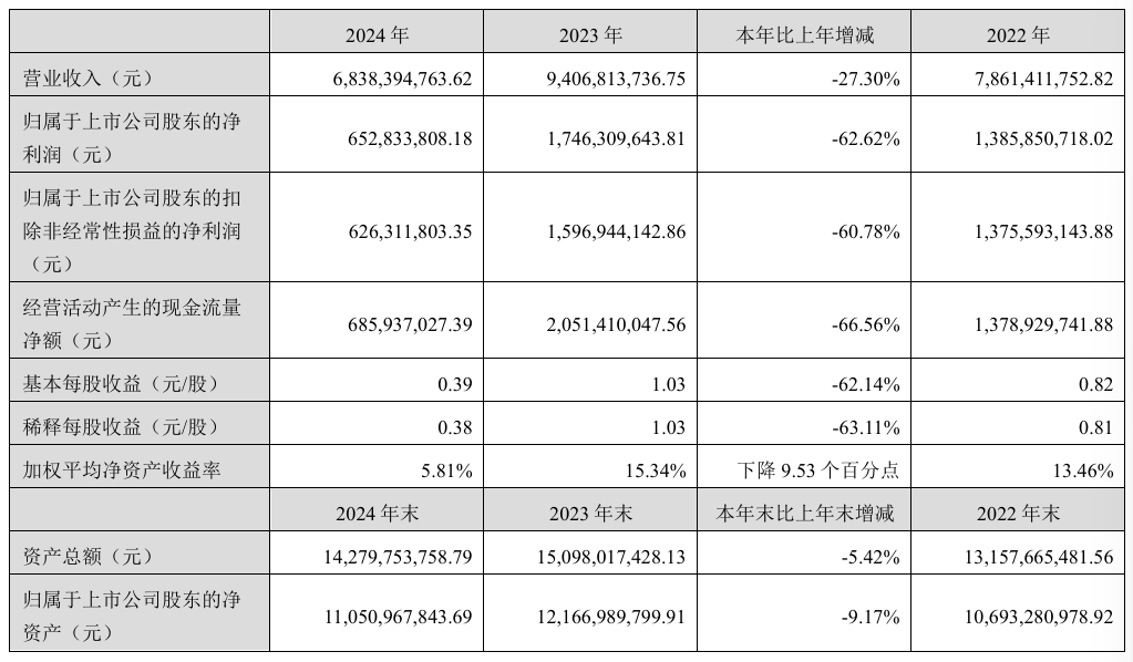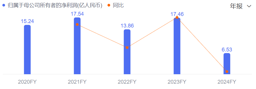 不仅如此,汤臣倍健的归母净利润也出现了明显下滑,由2023年的17.46亿元骤降至2024年的6.53亿元,降幅62.62%,近乎“膝斩”;扣非后净利润降至6.26亿元,较2023年同期的15.97亿元下降60.78%。