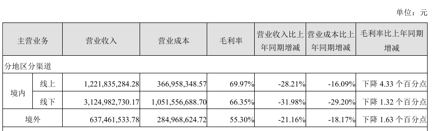 2024年,汤臣倍健的境内的线上渠道毛利率下滑4.33个百分点至69.97%,大有通过让利换取增长的势头。然而,该渠道过去一年的销售收入约34.18亿元,仍旧无法与线下渠道拉开差距,且出现了29.79%的下滑。