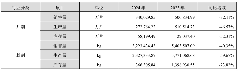 分产品来看,2024年汤臣倍健片剂、粉剂的销售金额分别为15.27亿元和8.60亿元,销售量分别为34万片和322.34kg,上述指标的降幅均超过30%,主要系核心产品迭代导致销售减少、该公司结合销售情况调整生产及库存所致。