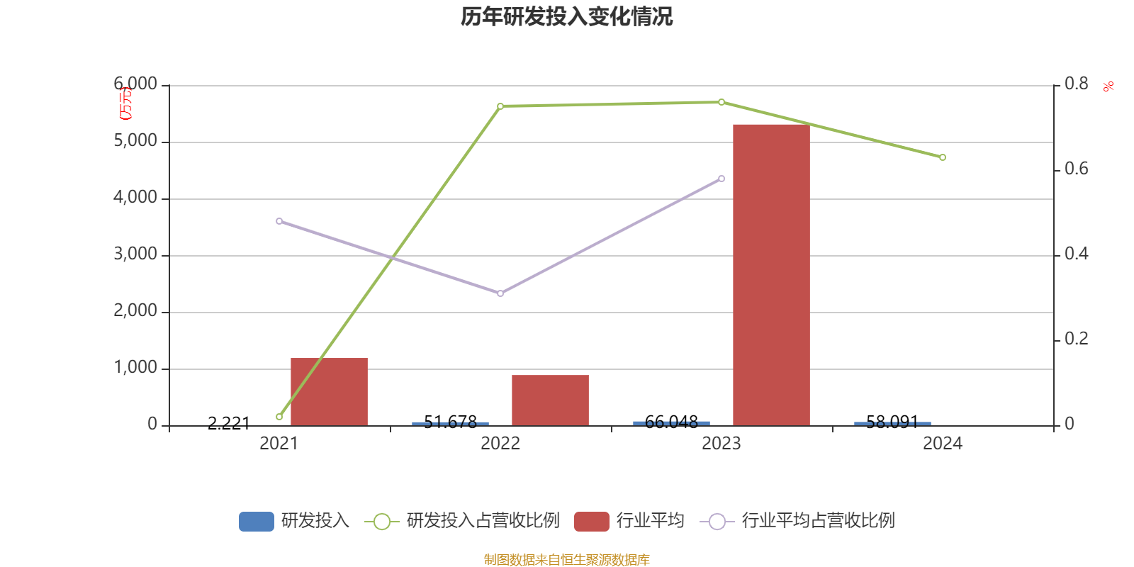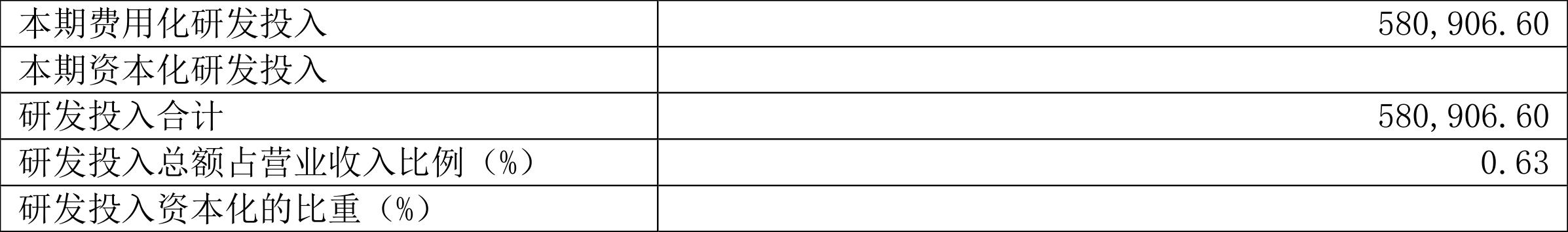 2024年全年,公司研发投入金额为58.09万元,同比下降12.05%;研发投入占营业收入比例为0.63%,相比上年同期下降0.13个百分点。此外,公司全年研发投入资本化率为0%。