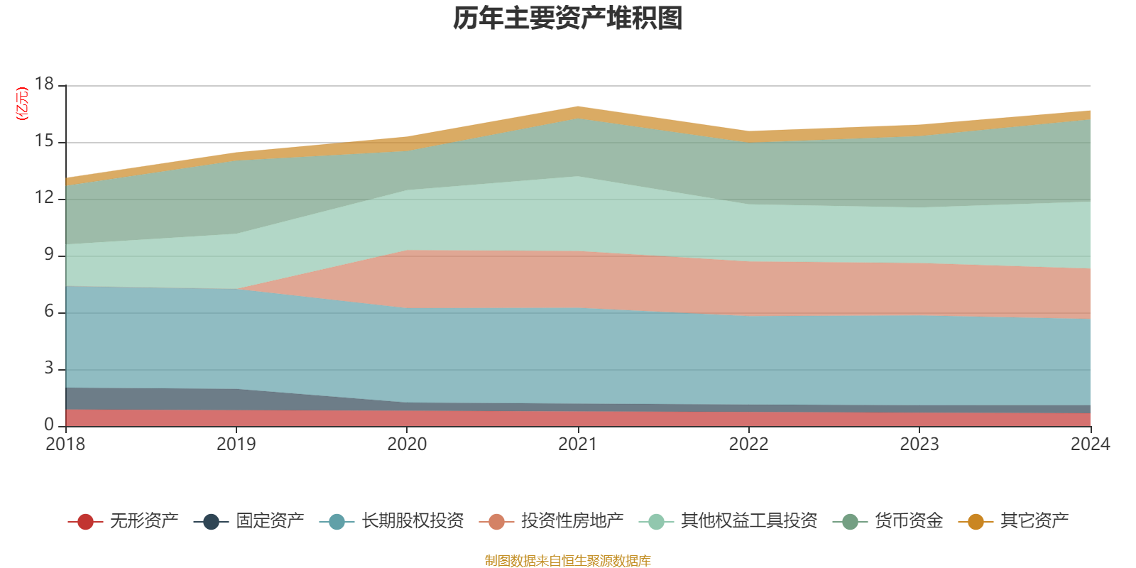 资产重大变化方面,截至2024年末,公司其他权益工具投资较上年末增加20.85%,占公司总资产比重上升2.84个百分点;长期股权投资较上年末减少3.97%,占公司总资产比重下降2.47个百分点;货币资金较上年末增加14.94%,占公司总资产比重上升2.32个百分点;投资性房地产较上年末减少4.14%,占公司总资产比重下降1.47个百分点。