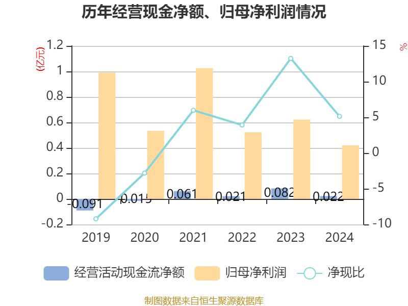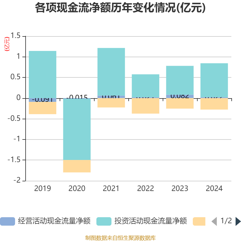 截至2024年,公司经营活动现金流净额为215.55万元,同比下降73.82%;筹资活动现金流净额-2774.59万元,同比减少237.82万元;投资活动现金流净额8219.21万元,上年同期为6985.47万元。