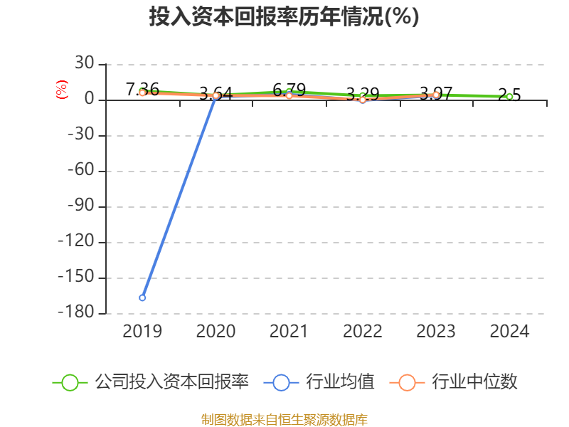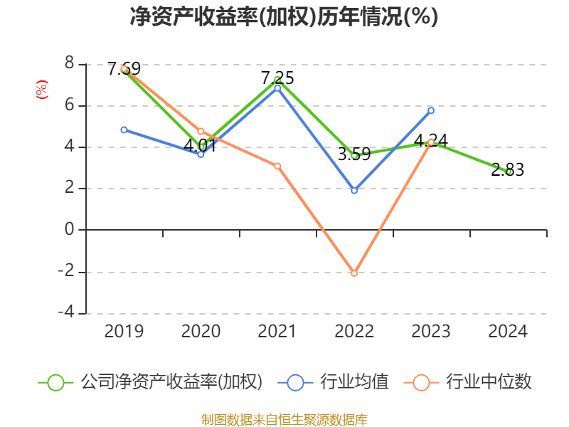 数据显示,2024年公司加权平均净资产收益率为2.83%,较上年同期下降1.41个百分点。公司2024年投入资本回报率为2.5%,较上年同期下降1.47个百分点。