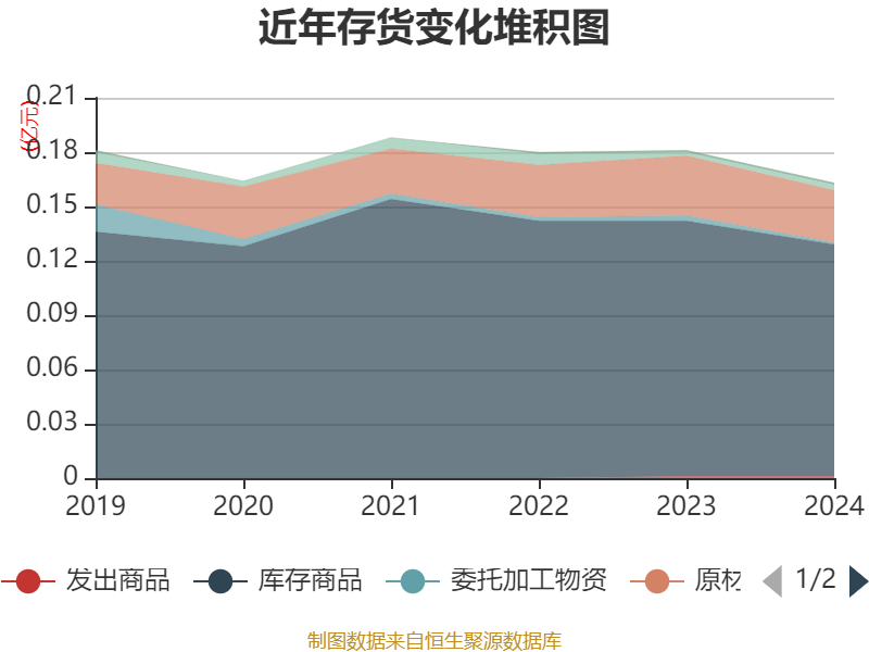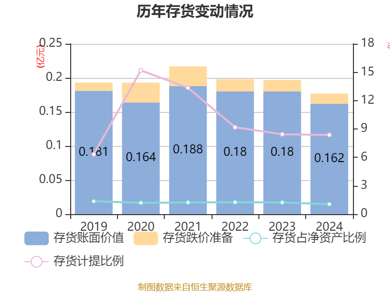 从存货变动来看,截至2024年末,公司存货账面价值为1624.92万元,占净资产的1.06%,较上年末减少176.82万元。其中,存货跌价准备为148.46万元,计提比例为8.37%。