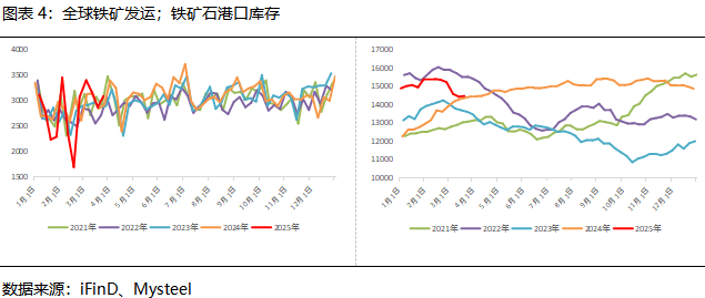 供应端3月在澳洲飓风扰动恢复后,铁矿发运重回高位,3月全球铁矿发运1.25亿吨,同比增加509万吨。且四大矿山今年发运目标较去年提升1000万吨以上,二季度发运将明显增加。受前期天气导致的发运回落和船期的影响,铁矿港口库存迎来一波较大幅度的去库,港口库存降至1.49亿吨左右。近期随着到港量回升,港口库存小幅累积,库存水平依旧处于高位。以及由于到港集中,卸货时间延长,压港船舶增加明显,尚未体现在库存中,铁矿供应依旧宽松。